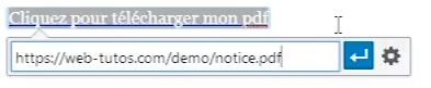 Si je veux donner accès au téléchargement d’un fichier PDF, je vais mettre le lien vers le fichier en question comme ceci :