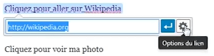 Pour attribuer un lien, je sélectionne ma phrase. Ensuite, je clique sur la petite chaîne symbolisant le lien. Dans la fenêtre qui apparaît, je mets l’adresse Web Wikipédia et valide. Hop, mon lien est créé.